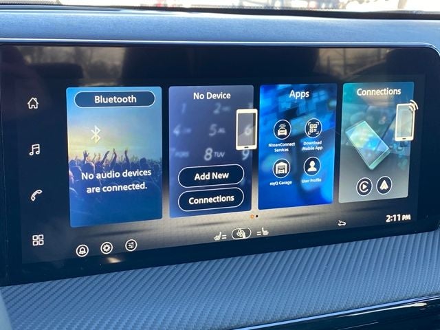 - Radio: AM/FM/SiriusXM Audio System -inc: 12.3" color touchscreen display w/6 speakers, Bluetooth® hands-free phone system, streaming audio via Bluetooth®, NissanConnect Services powered by SiriusXM featuring wireless Apple CarPlay, wireless Android Auto, Siri eyes free and hands-free text messaging assistant, audio and Bluetooth® steering wheel switches and Wi-Fi hotspot